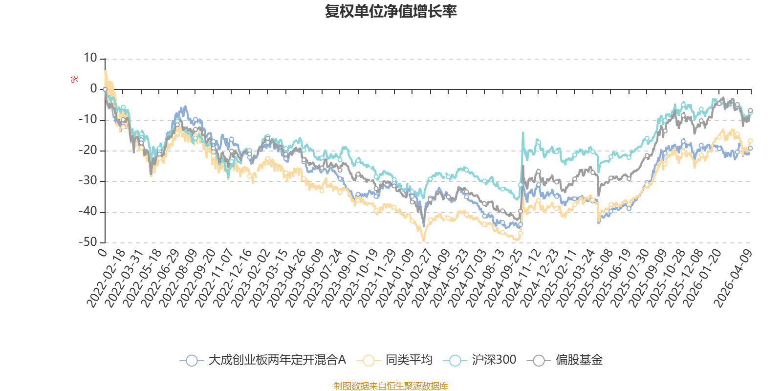 截至4月9日,大成创业板两年定开混合A近三个月复权单位净值增长率为-1.10%,位于同类可比基金307/621;近半年复权单位净值增长率为-1.45%,位于同类可比基金386/621;近一年复权单位净值增长率为42.26%,位于同类可比基金270/618;近三年复权单位净值增长率为-0.17%,位于同类可比基金418/559。