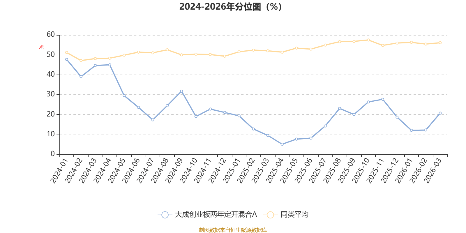 通过所选区间该基金净值增长率分位图,可以观察该基金与同类基金业绩比较情况。图为坐标原点到区间内某时点的净值增长率在同类基金中的分位数。
